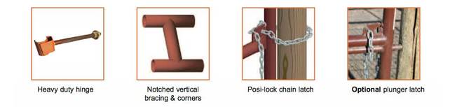 While constructed of the same material as the Heavy Duty Gate, a sixth rail was added and the space reduced between the lower rails. An optional Plunger Latch makes this gate self-latching.