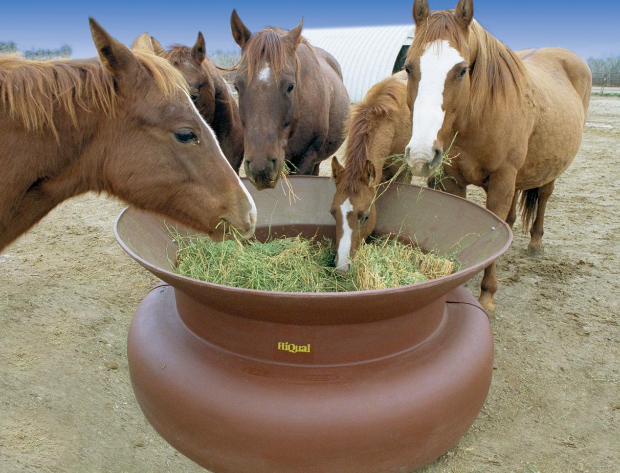 HiQual's patented Ground Feeder is a safe, cost effective and natural feeding alternative for feeding small square bales. The bell shaped design eliminates "spooning" and reduces waste. The rotational molded virgin poly material is highly durable and animal safe.