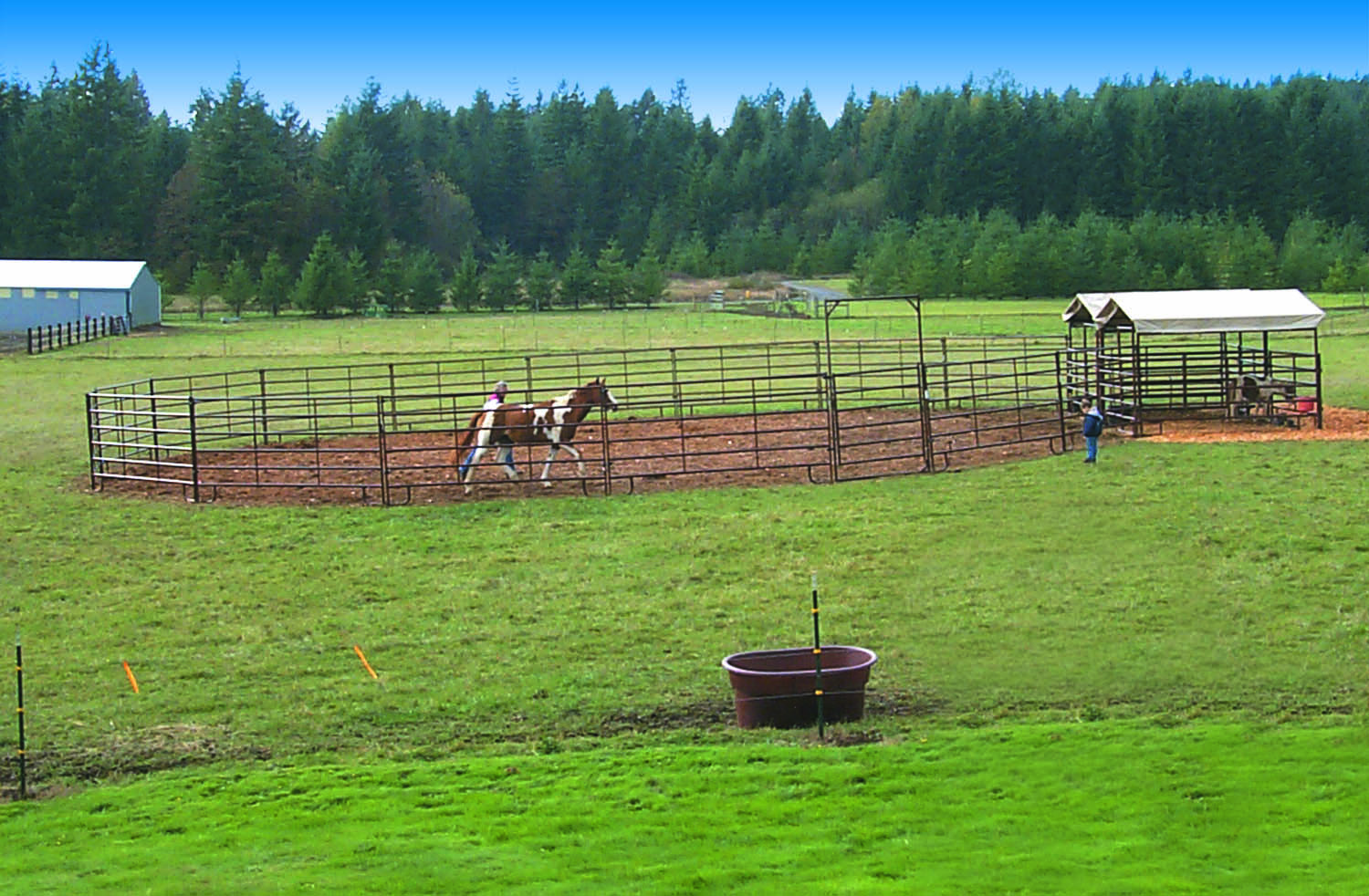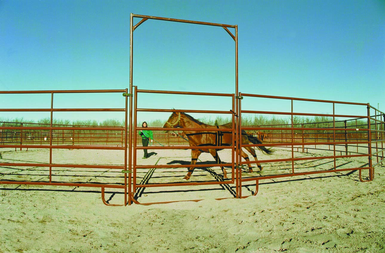 HiQual Round Pens come in 40' and 60' diameters and include a 6' wide x 10' tall Ride Thru Gate with lever latch.